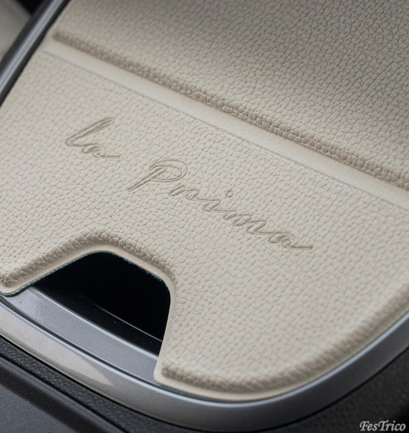 インテリアには、外装のブラックと美しいコントラストとなるアイボリーのレザーをあしらった。センターコンソールパッドに「La Prima」の文字をデザイン。