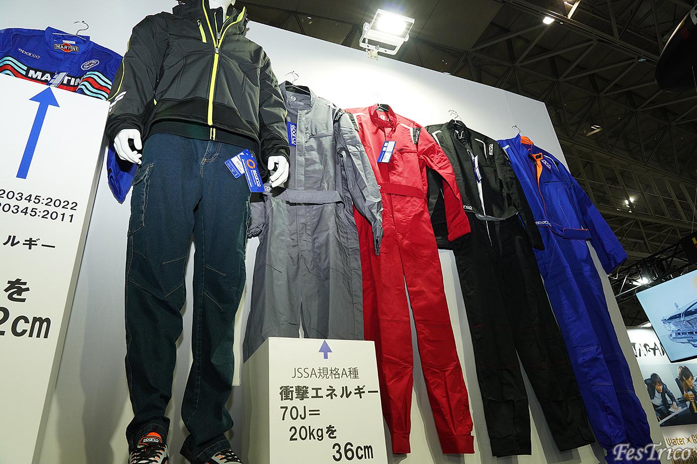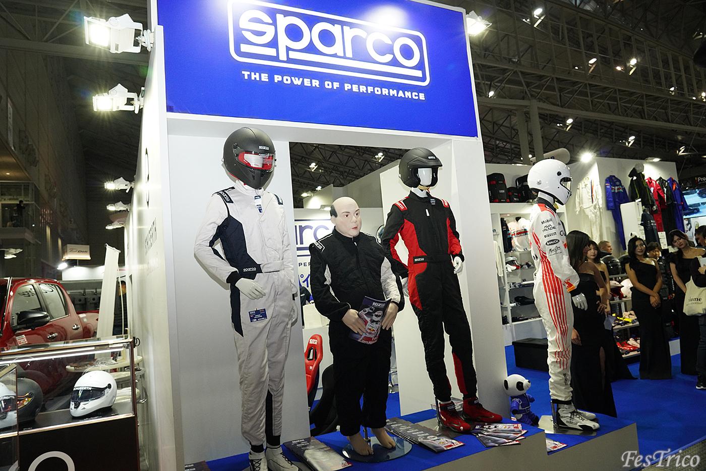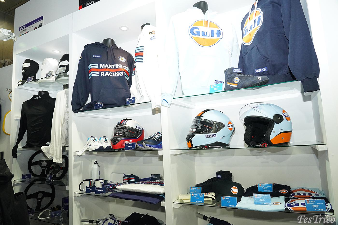 エンパイヤ自動車/スパルコのブースでは、スーツをはじめとしたレーシンググッズ、ファッショナブルなアパレルがずらり。見ているだけでも楽しくなってしまう!