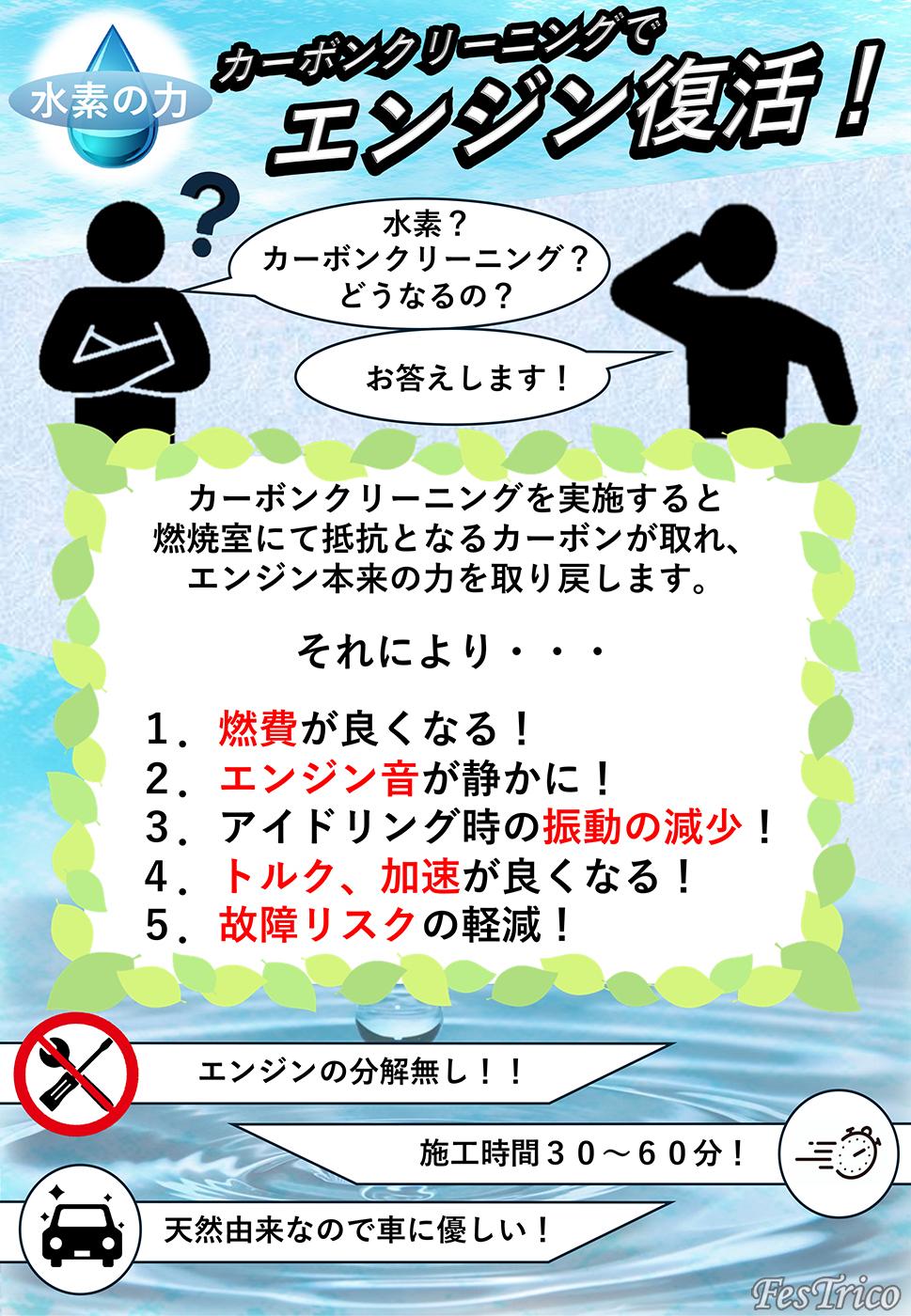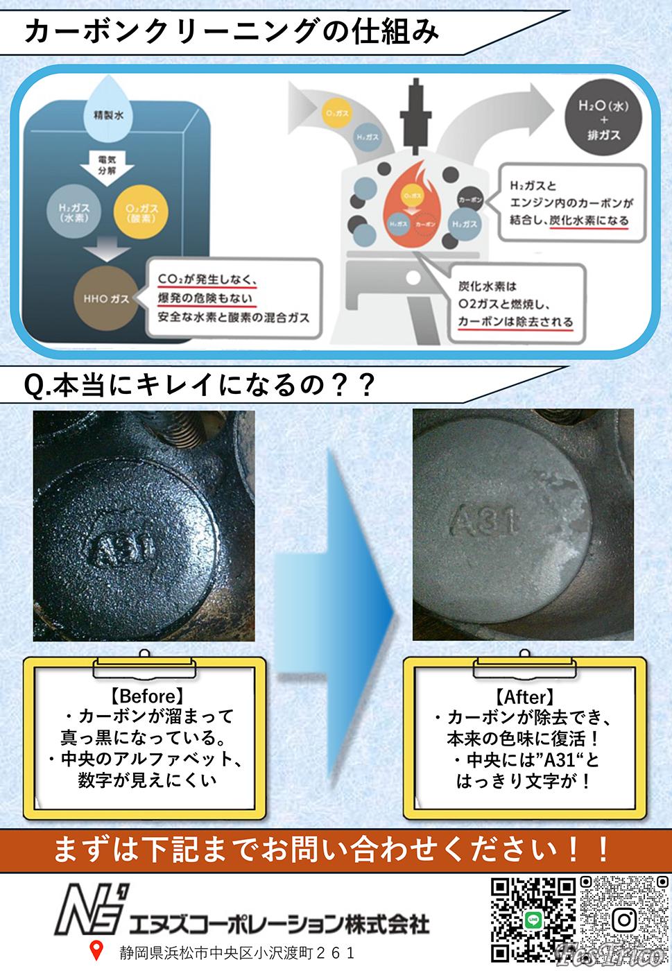 同社はエンジン燃焼室の掃除を得意としており、水をエアクリーナーから注入、燃焼室に付着しているカーボンを酸水素で燃やしきるというサービス内容。燃やしきったカーボンは排気ガスとともに排出されるので安心だ。