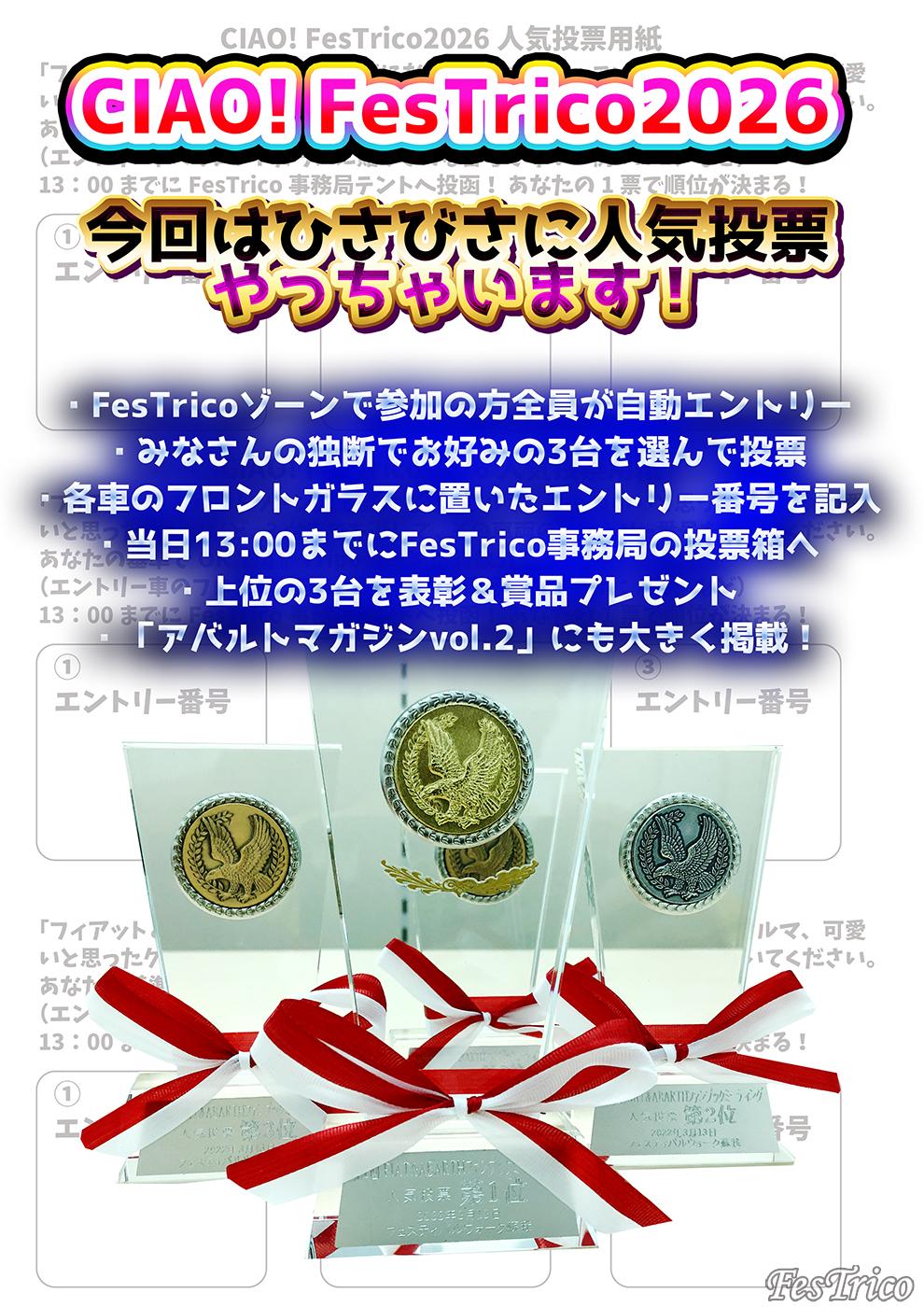 FesTricoゾーンのフィアットアバルト車が対象。当日、フロントガラス(ダッシュボード)に置いていただくエントリー番号を記入してください。投票は、13:00で締め切りますので、どうぞお早めに。フェストリコ事務局のテントに投票箱を設置します。