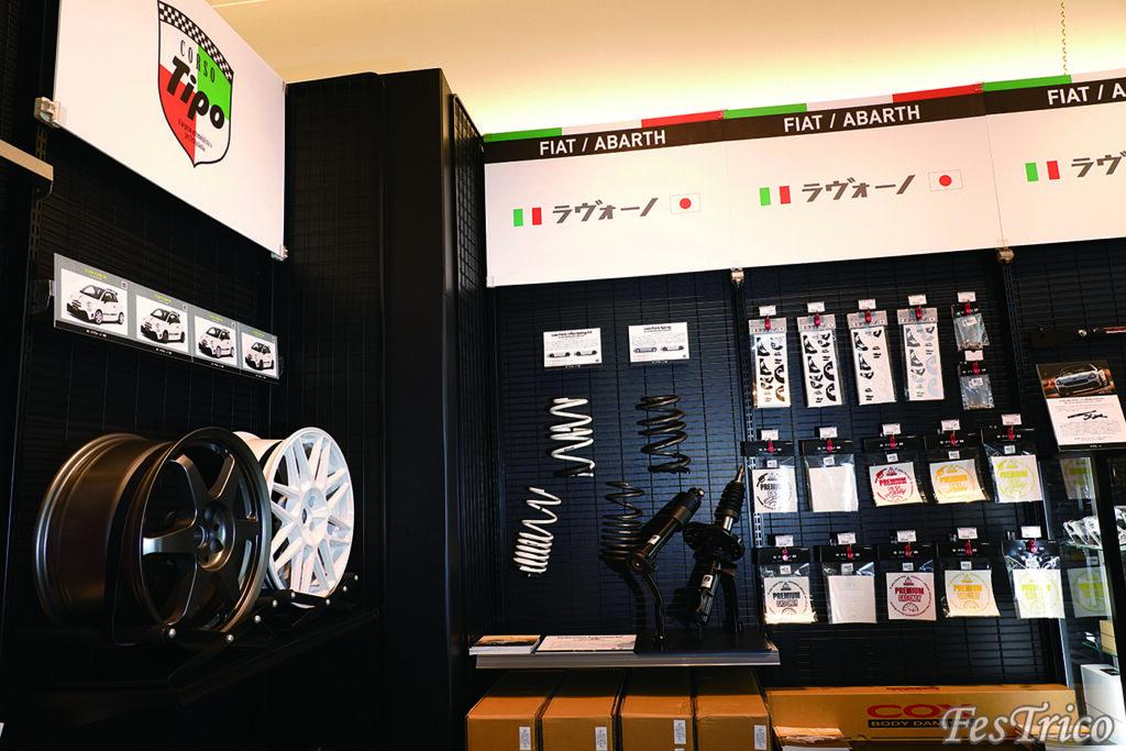 注目は、フィアット&アバルトのパーツだけを厳選して並べた「CORSO TIPO(コルソティーポ)」が設置されているところだ。
