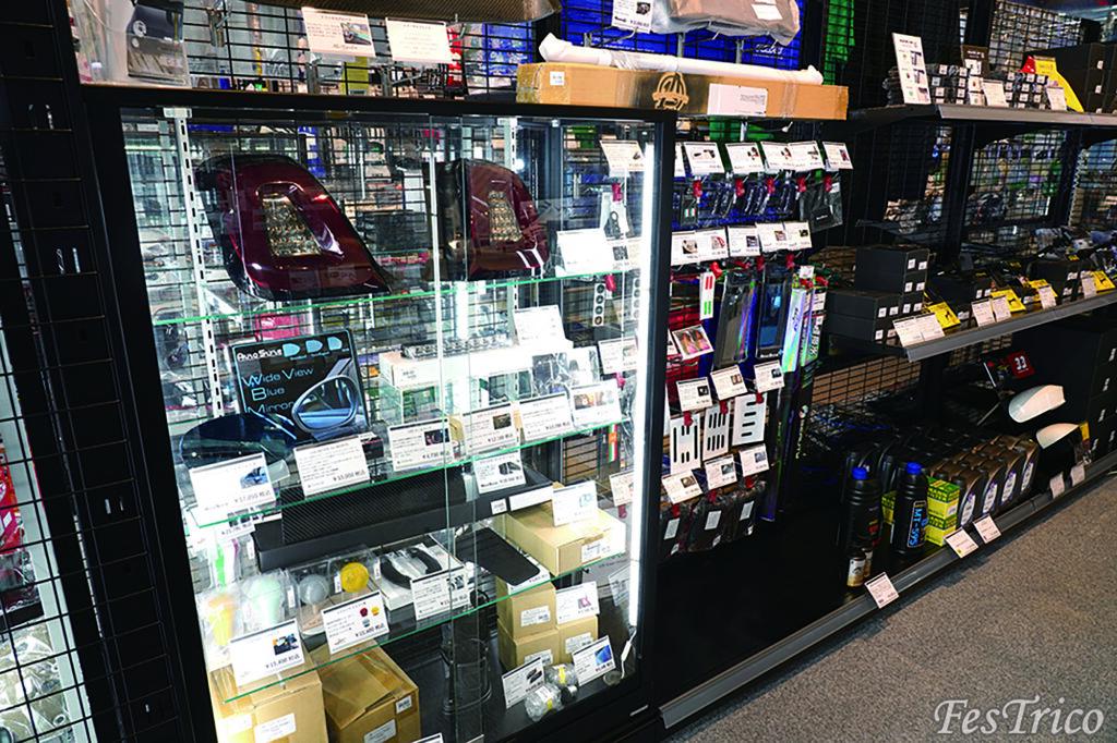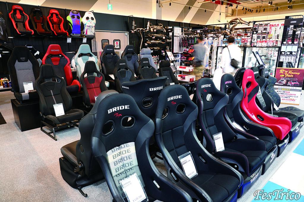 「RECARO」「BRIDE」などのスポーツシートやマフラー、サスペンションも実物がギッシリと展示され、見ながら商談できるのは大きなポイント。