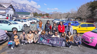 前日の大雪が嘘のような快晴に恵まれた、朝霧高原に集まったフィアット&アバルトの女性オーナーさん。肌寒い中でしたが、みんなで親交を深めていただきました。アンバサダーのあゆタマ。ちゃん、お手伝い女性スタッフ含めて、15台が一堂に会しました。